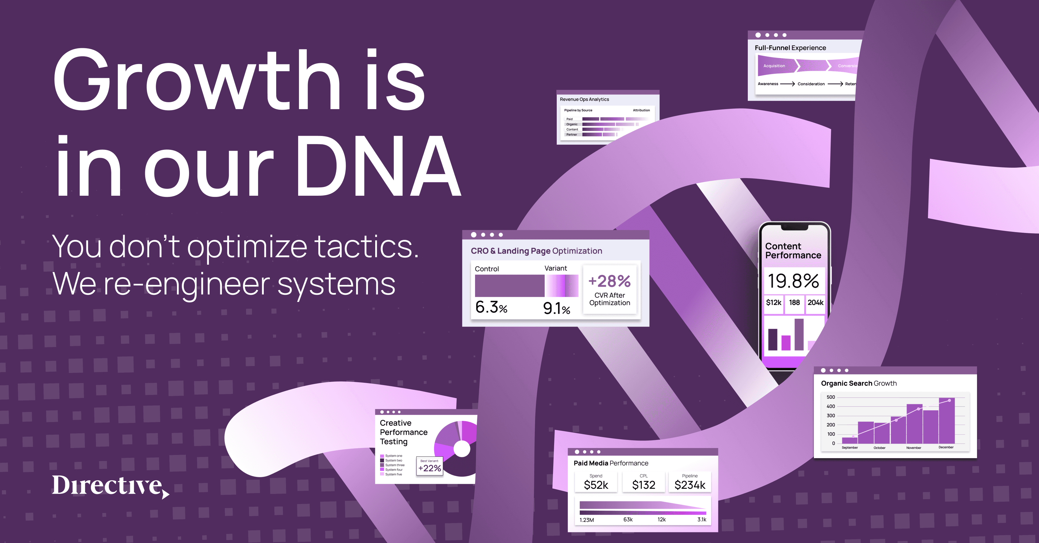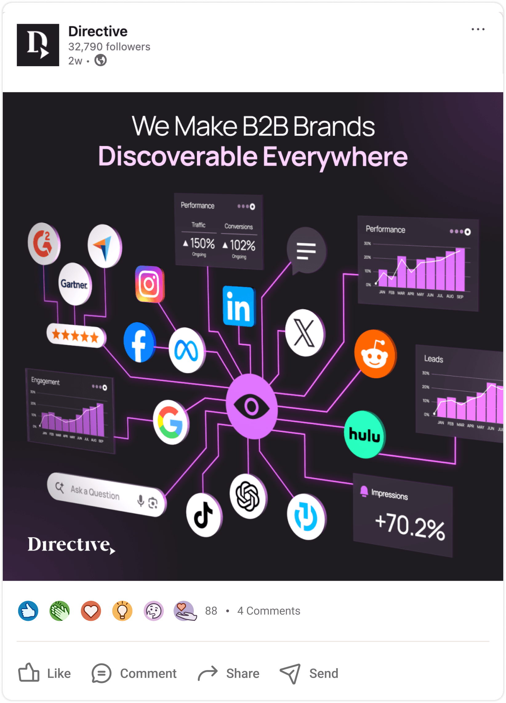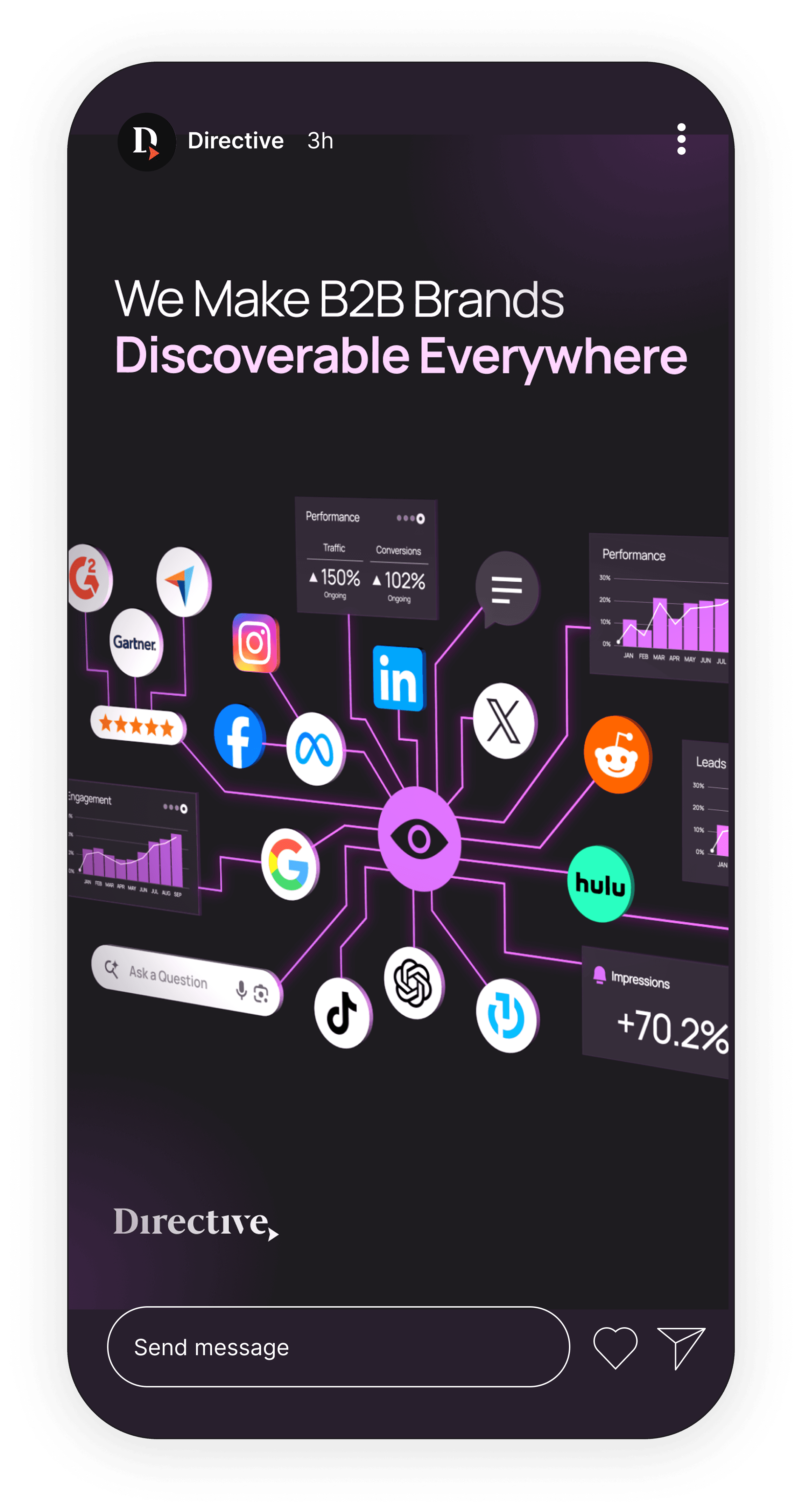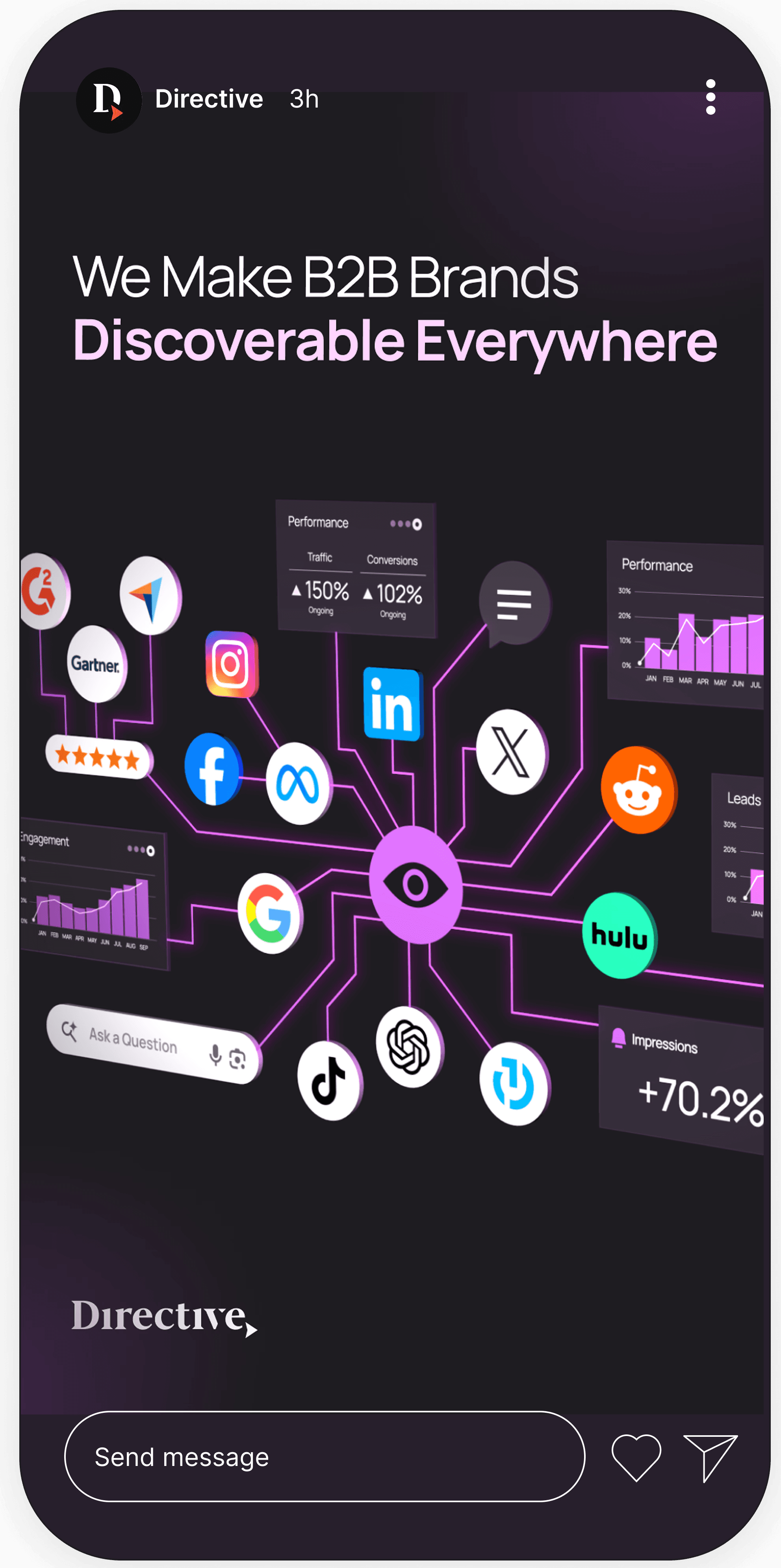 This ad shows how Directive makes B2B brands discoverable across search engines, social platforms, and LLM-powered tools. The connected system of platforms and performance metrics reinforces the idea that visibility today requires coordinated, cross-channel strategy—not isolated tactics.