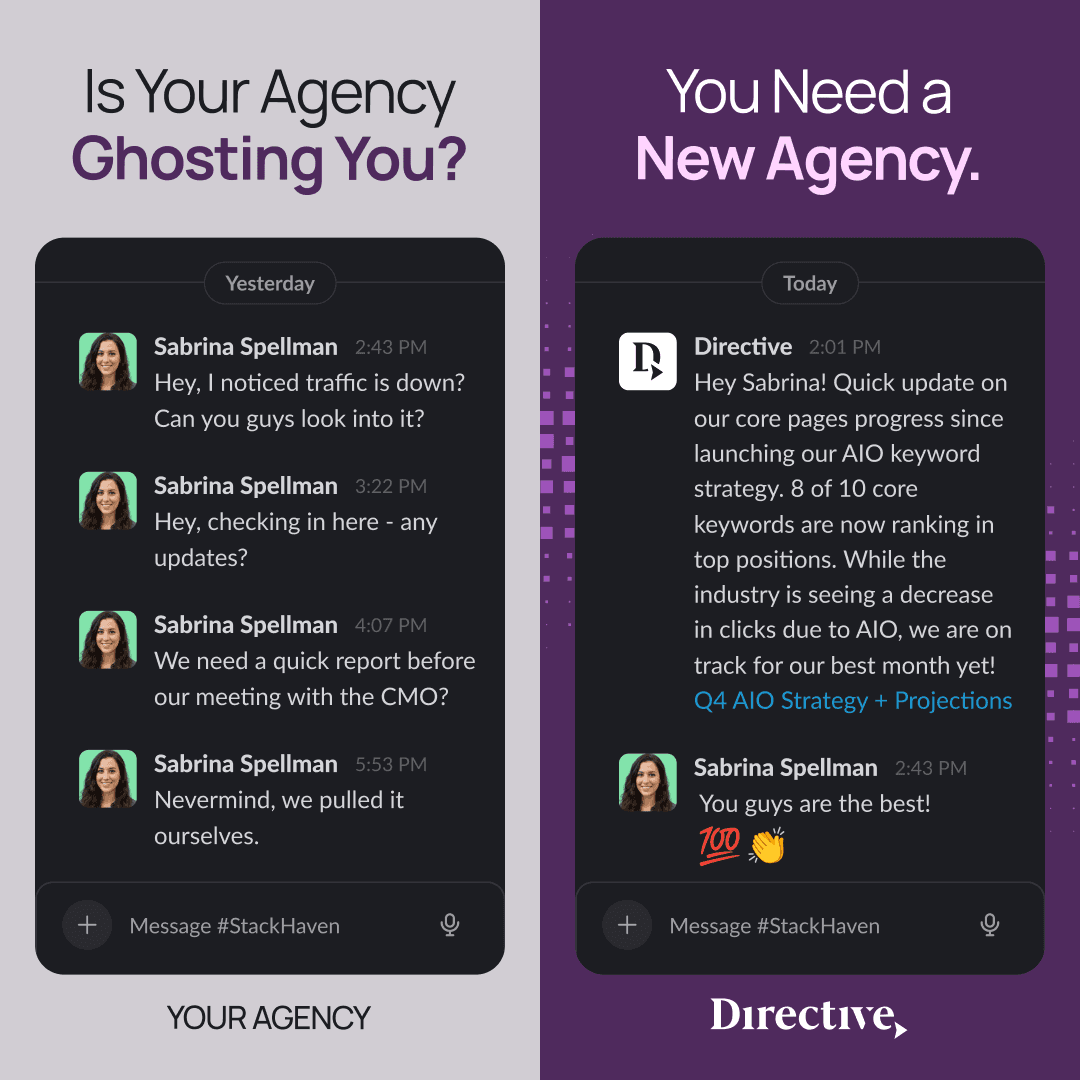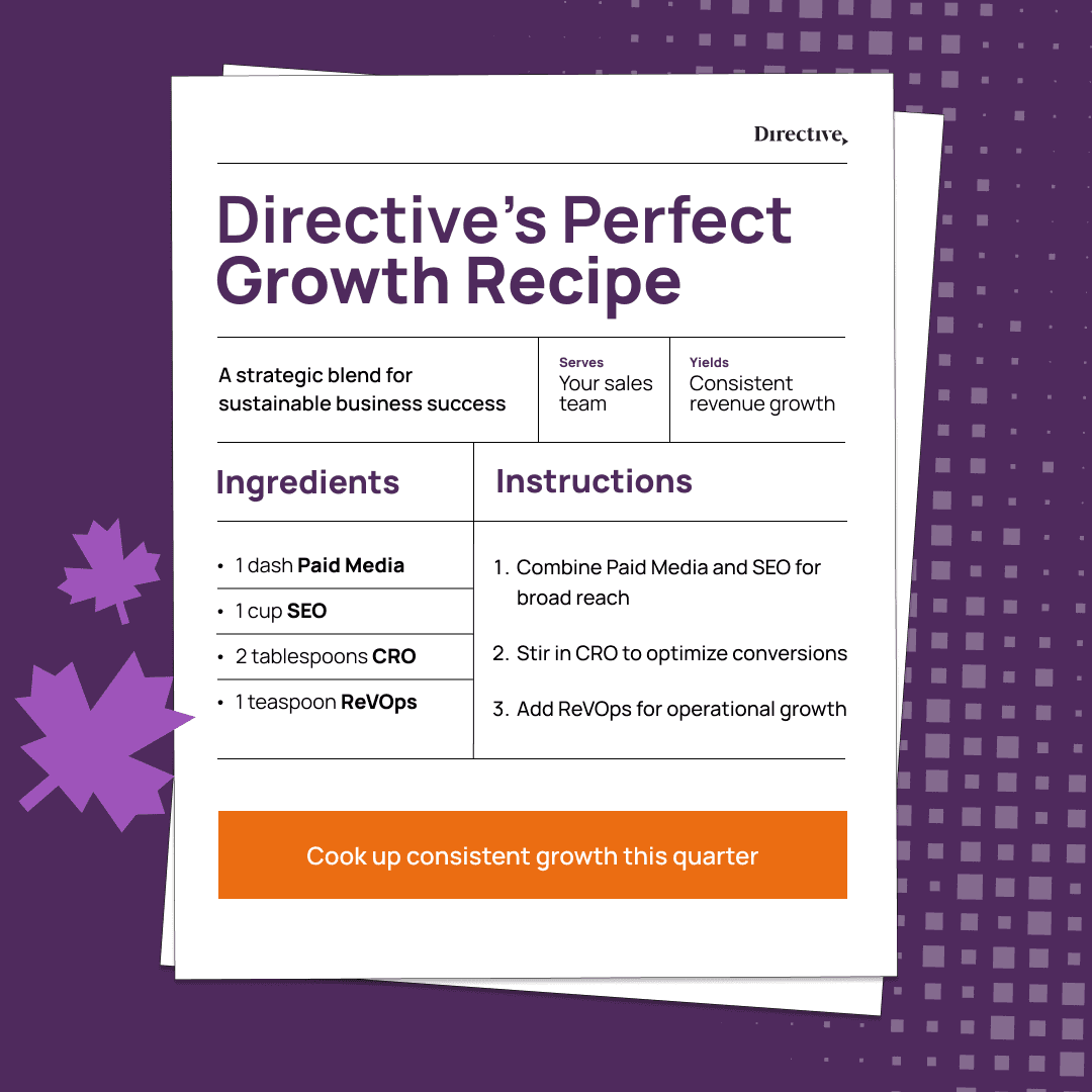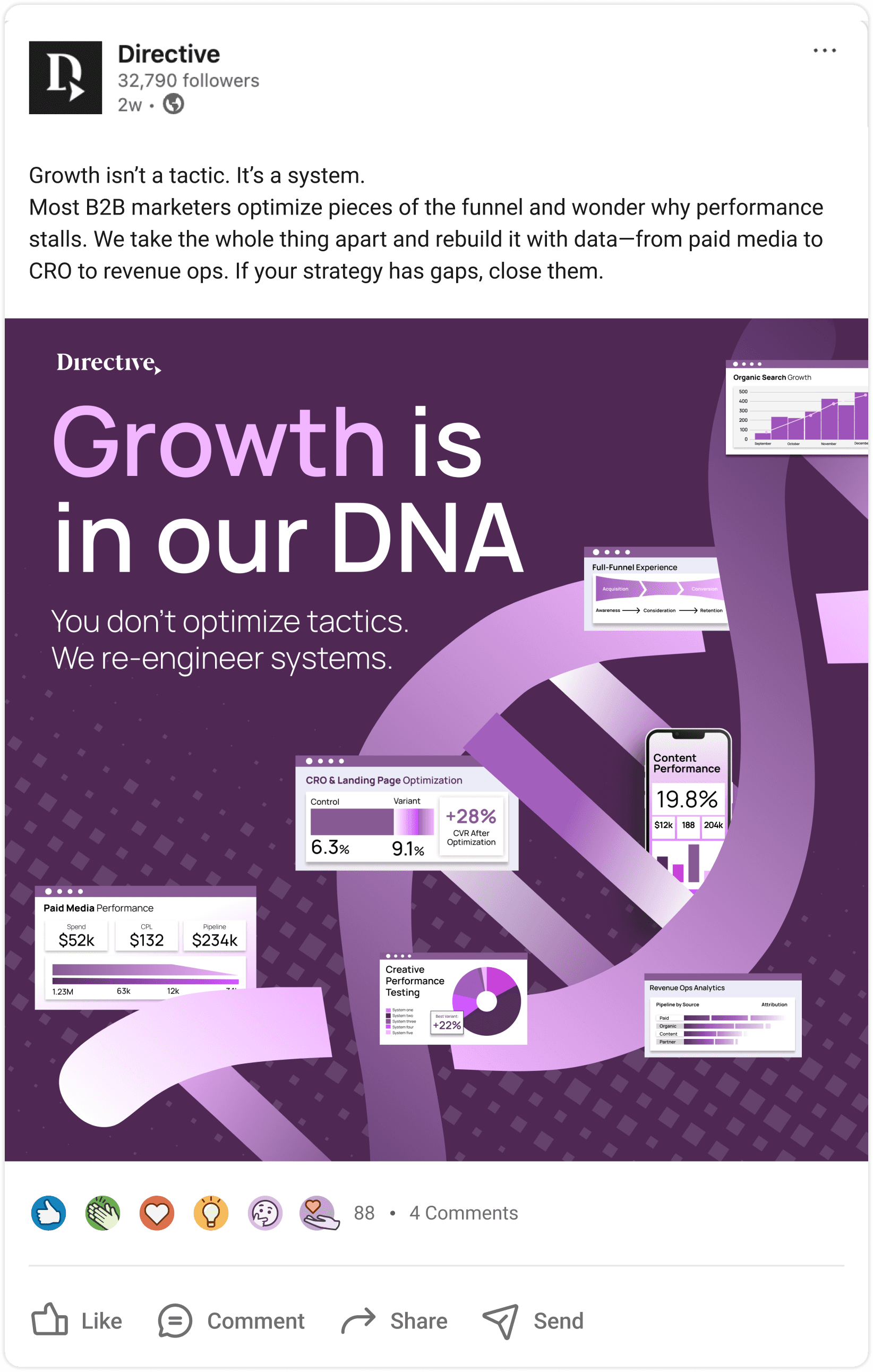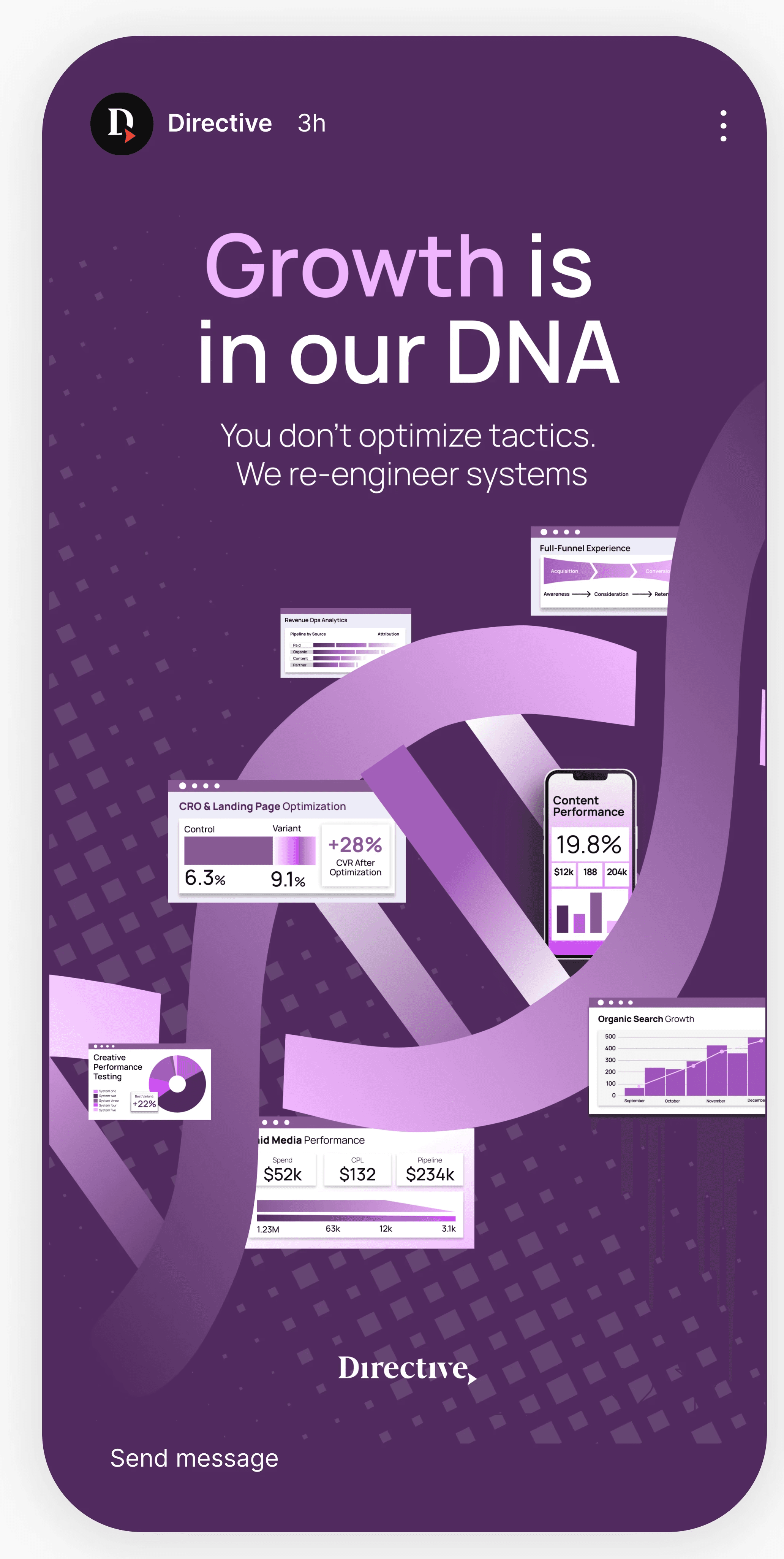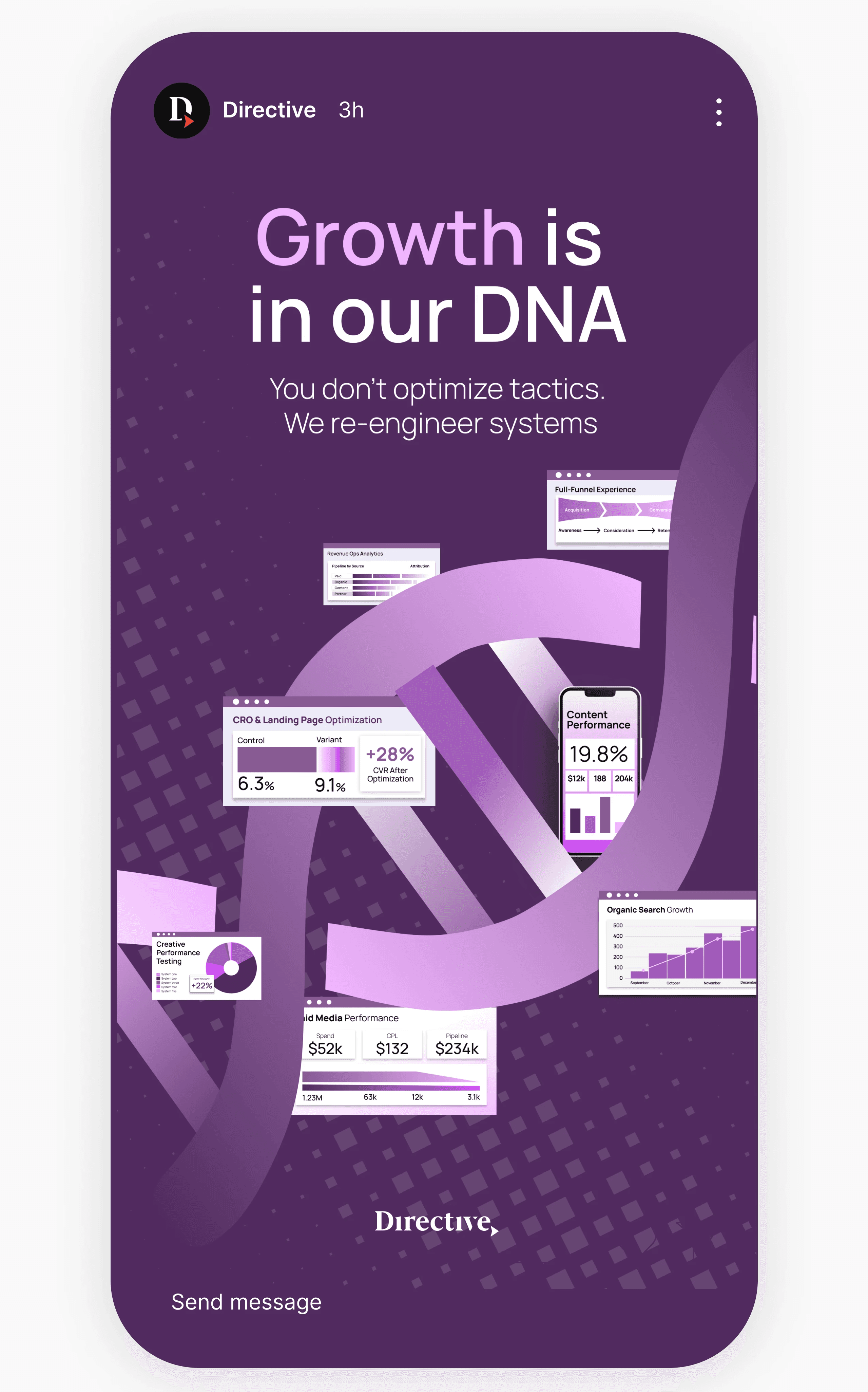 This ad shows how Directive makes B2B brands discoverable across search engines, social platforms, and LLM-powered tools. The connected system of platforms and performance metrics reinforces the idea that visibility today requires coordinated, cross-channel strategy—not isolated tactics.