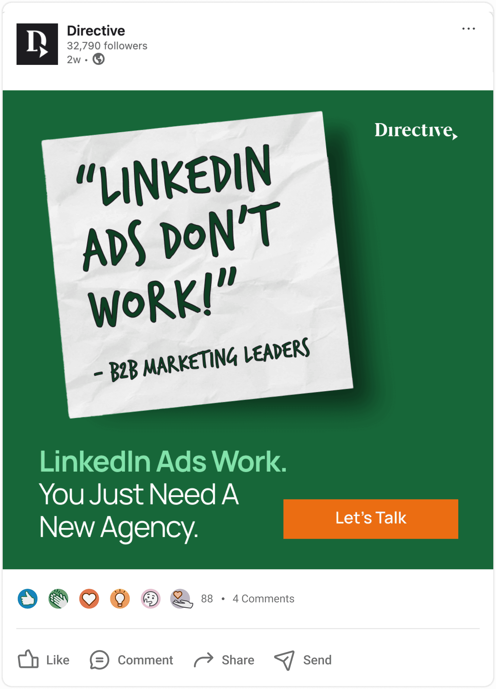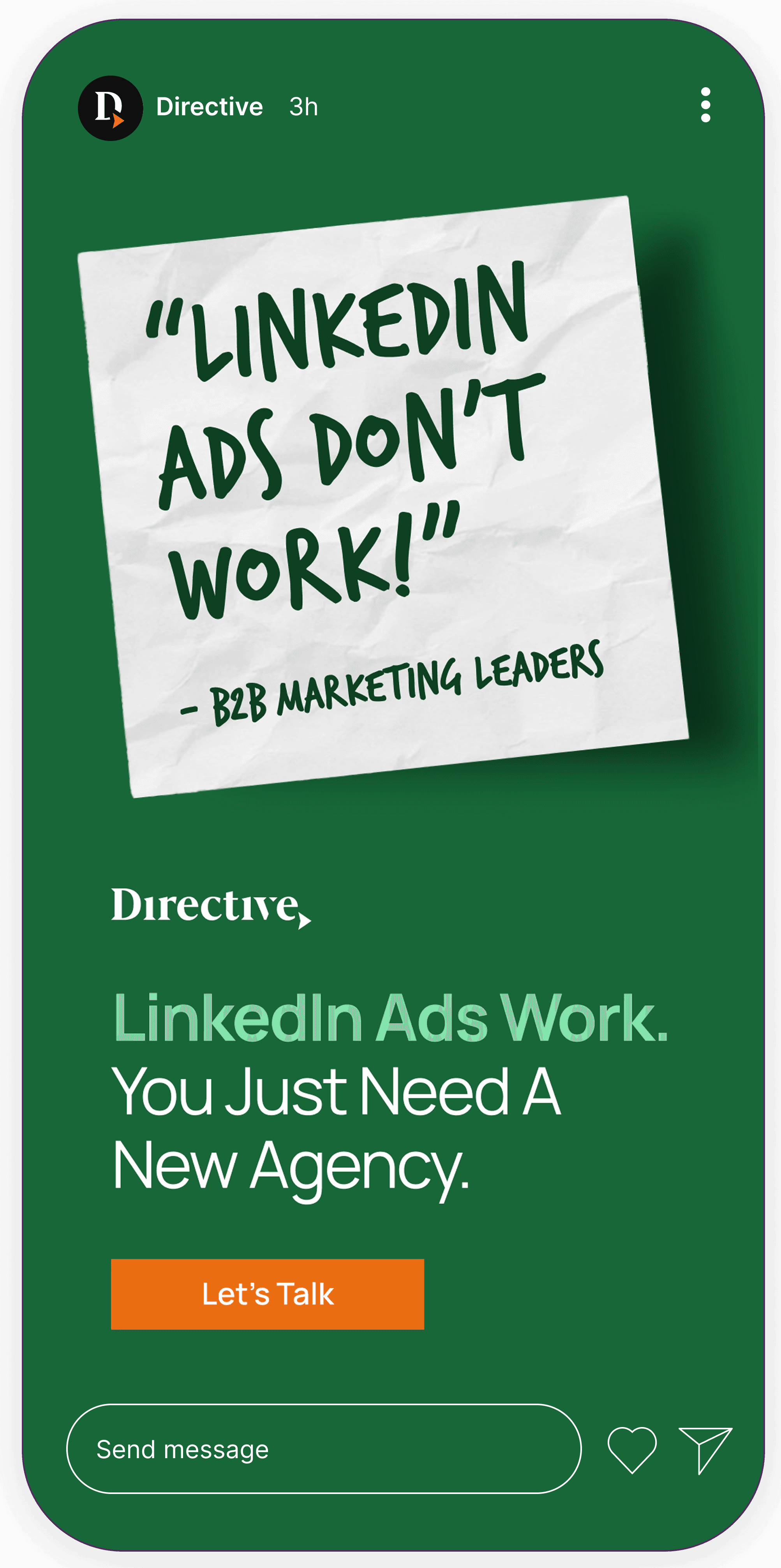 This ad speaks directly to frustrated B2B marketing leaders who feel their LinkedIn campaigns are failing. The crumpled paper visual captures that moment of irritation and skepticism toward paid social performance. The bold headline reframes the problem by implying the issue isn’t the channel—it’s the agency behind it.