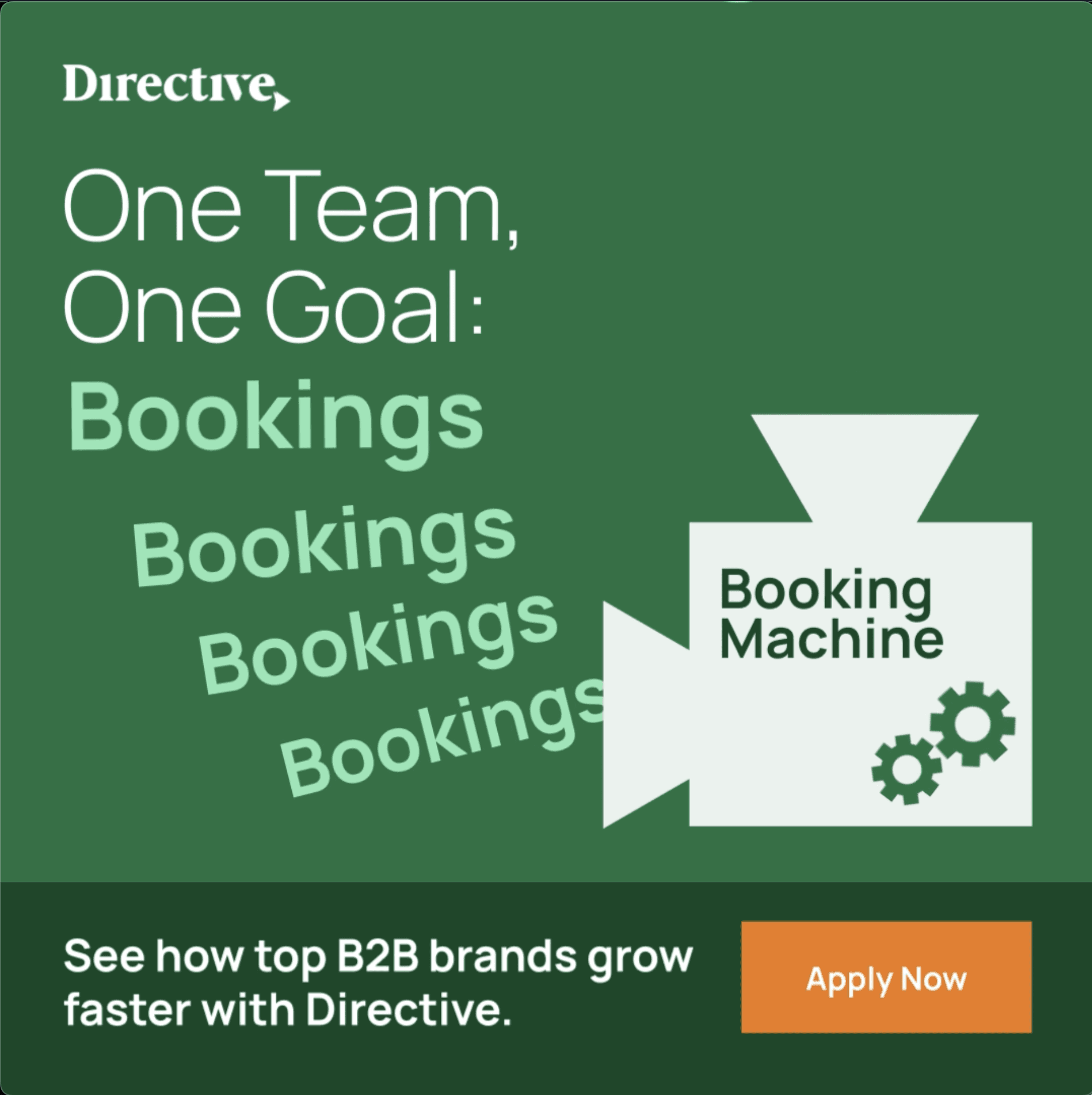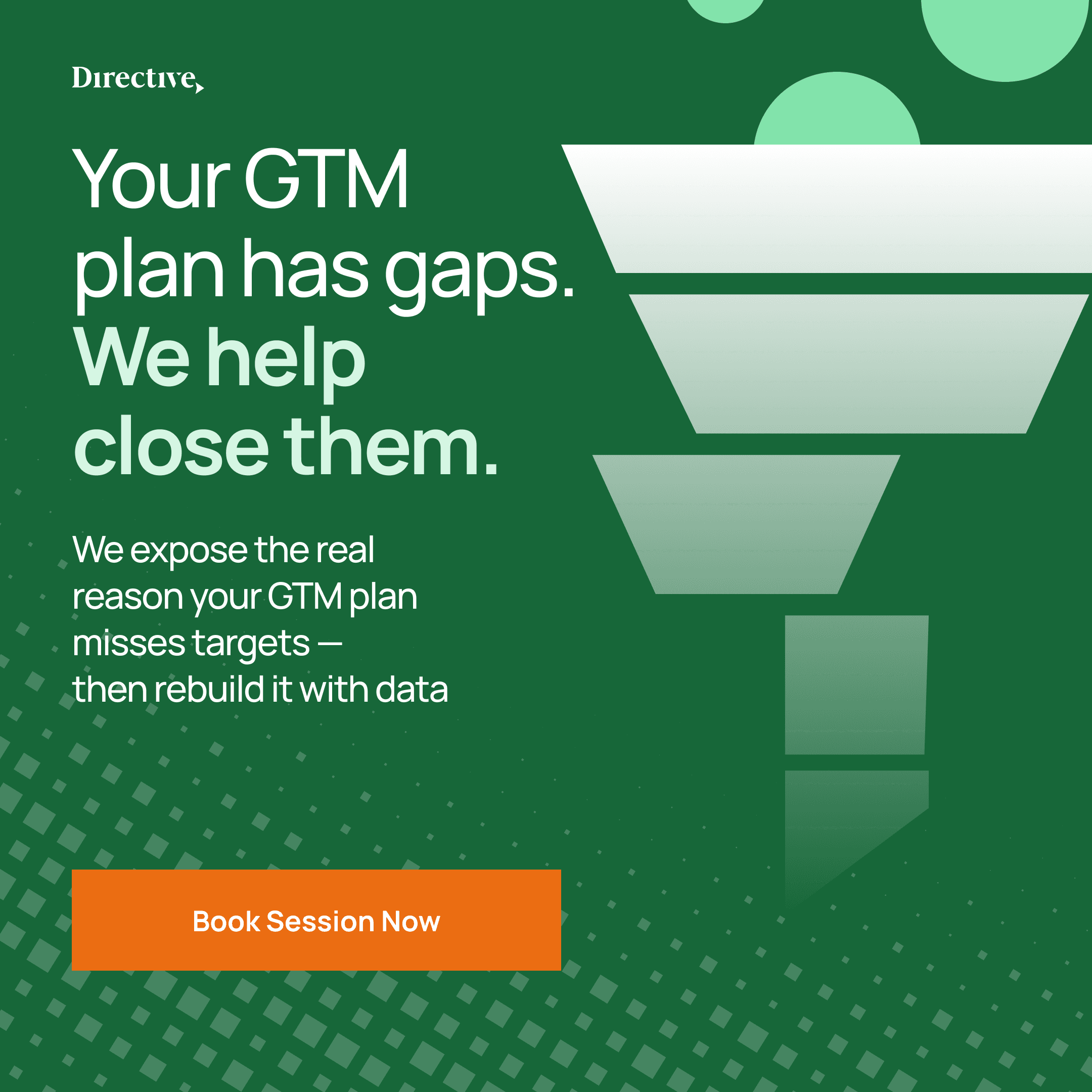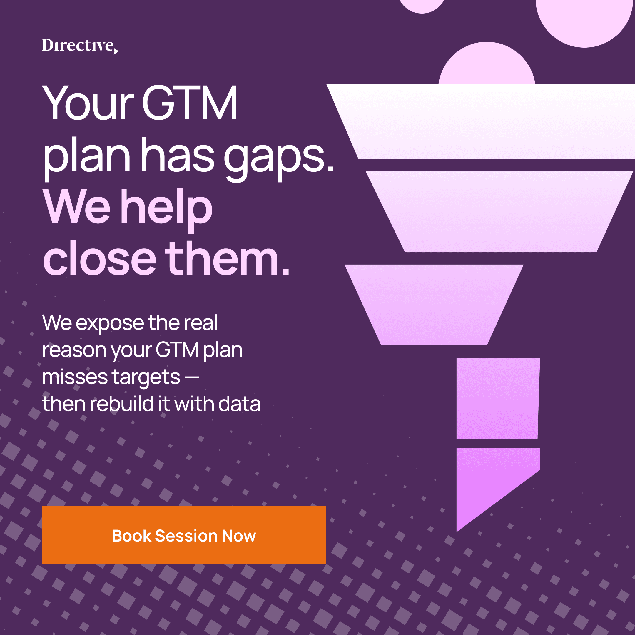 The ad targets companies whose go-to-market plans aren’t hitting revenue goals. It explains that marketing teams often have structural gaps and siloed functions. The piece positions Directive Consulting as the partner that diagnoses and fixes those gaps with data-driven strategy, inviting viewers to book a session to improve performance.