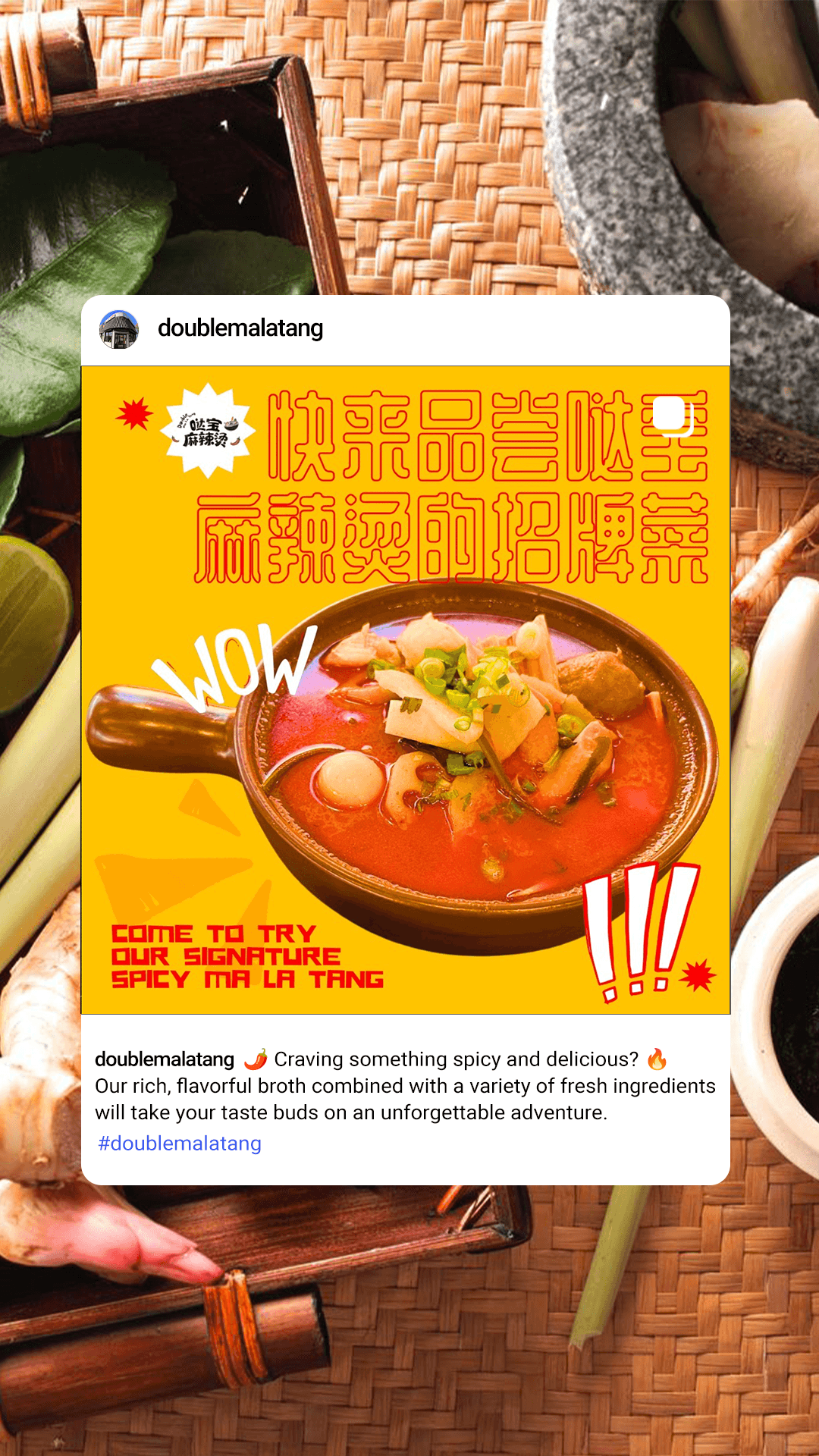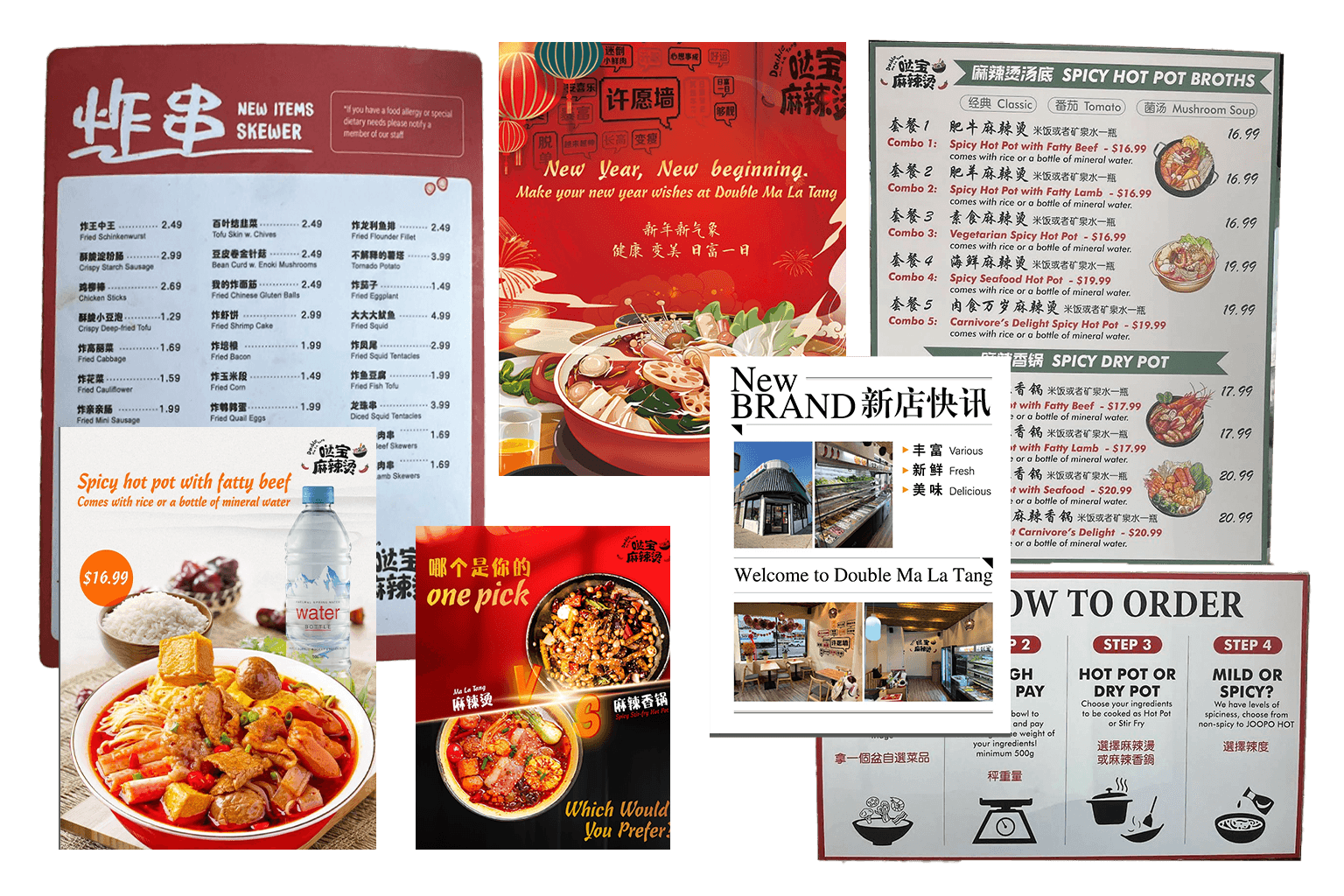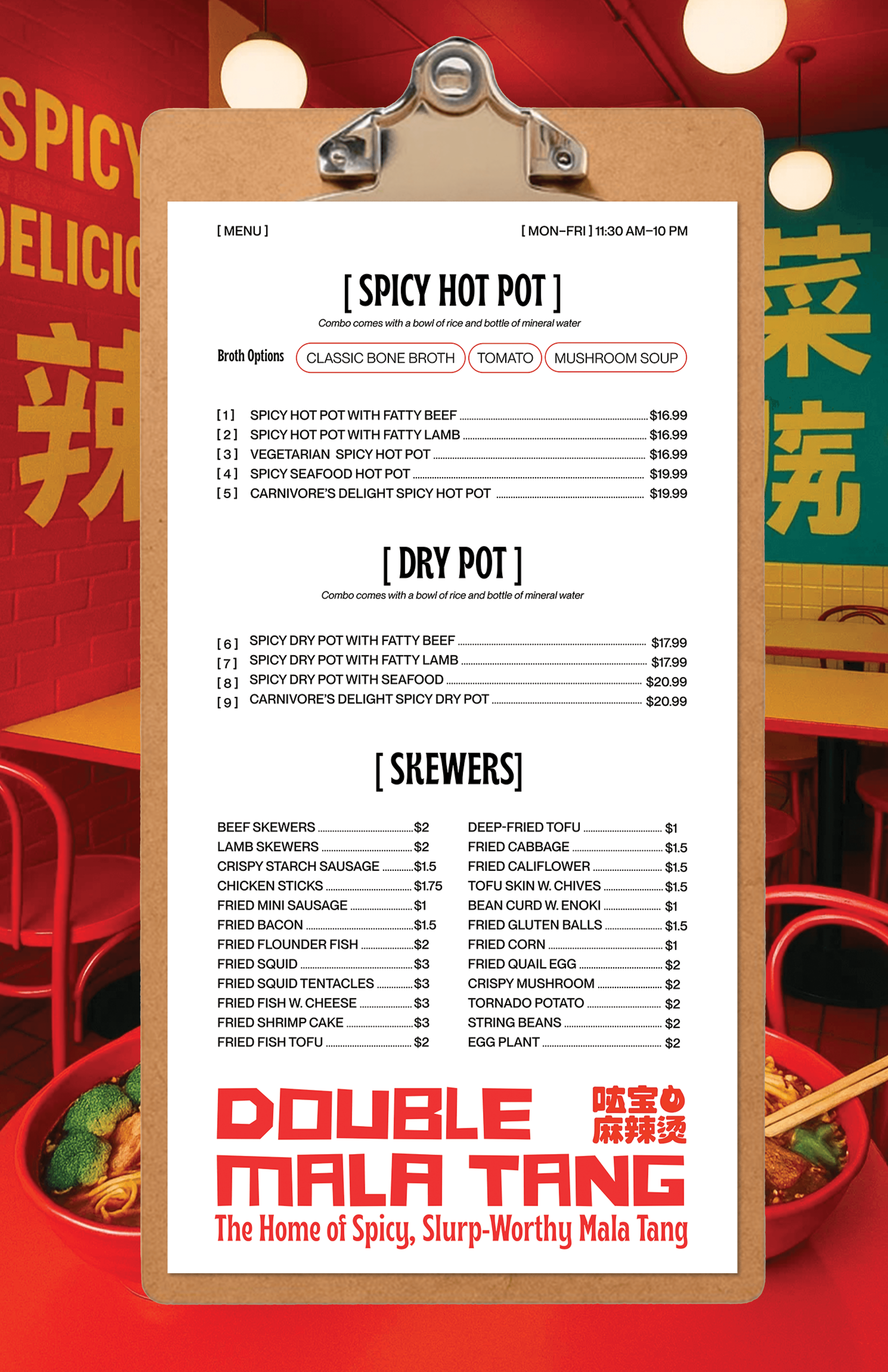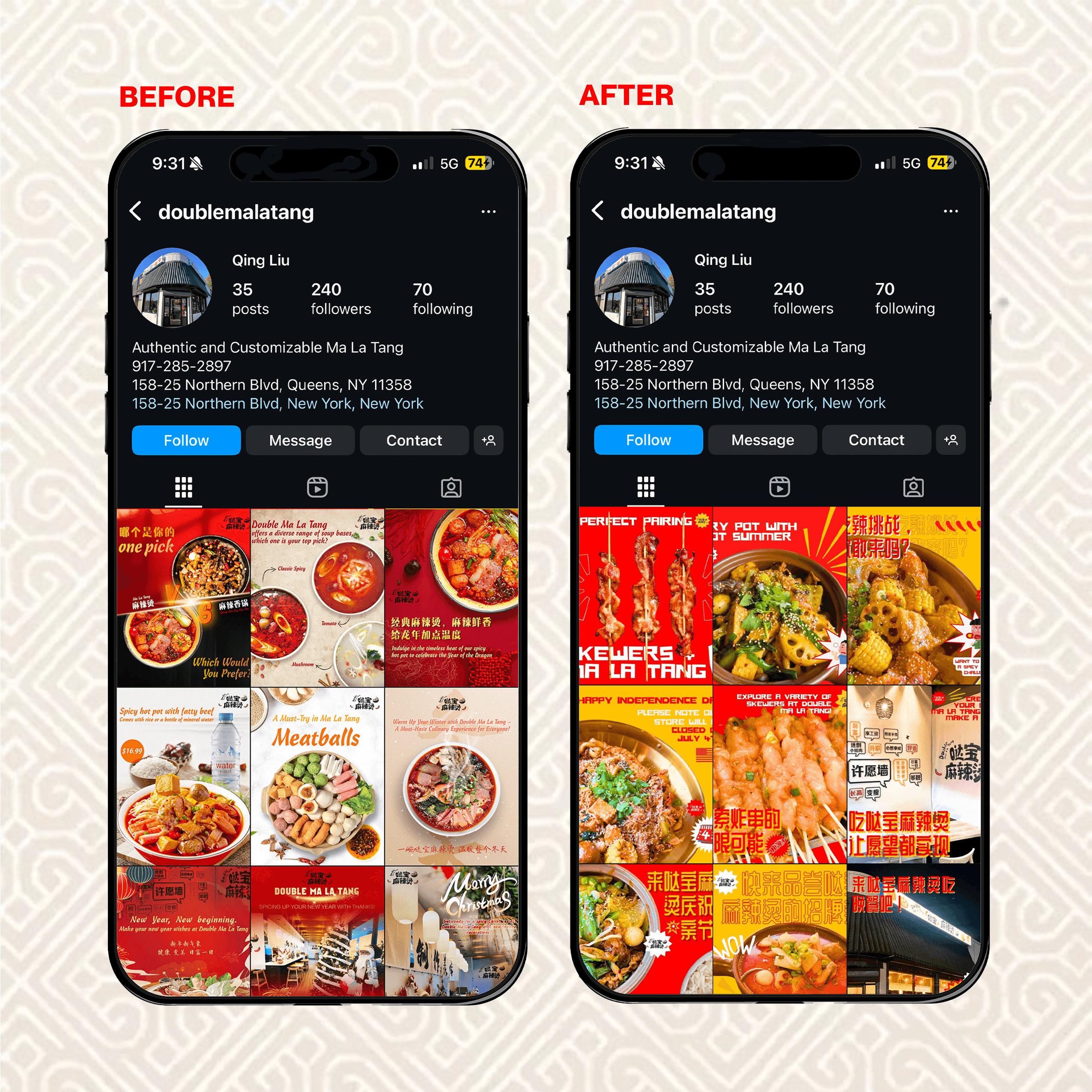 Double Mala Tang is a Chinese mala tang restaurant in Flushing, Queens that underwent a full brand refresh across digital and physical touchpoints. I redesigned the visual identity to better reflect the restaurant’s bold, energetic dining experience while balancing traditional Chinese references with a modern aesthetic. The work included branding, social media visuals, and printed materials such as menus and postcards. The new system created a consistent, recognizable presence across platforms and in-store.
